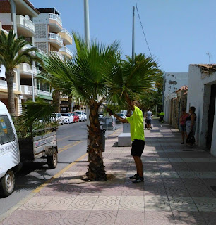 Por la mañana, pronto para evitar la aglomeración de gente suelo ir a caminar por nuestra magnífica playa por la Avda. Mare Nostrum, de bola a bola, 2.46 km sobre les 25' y a veces algunos minutos más, y lo molesto es que tienes que ir esquivando las palmas sueltas que invaden la acera.